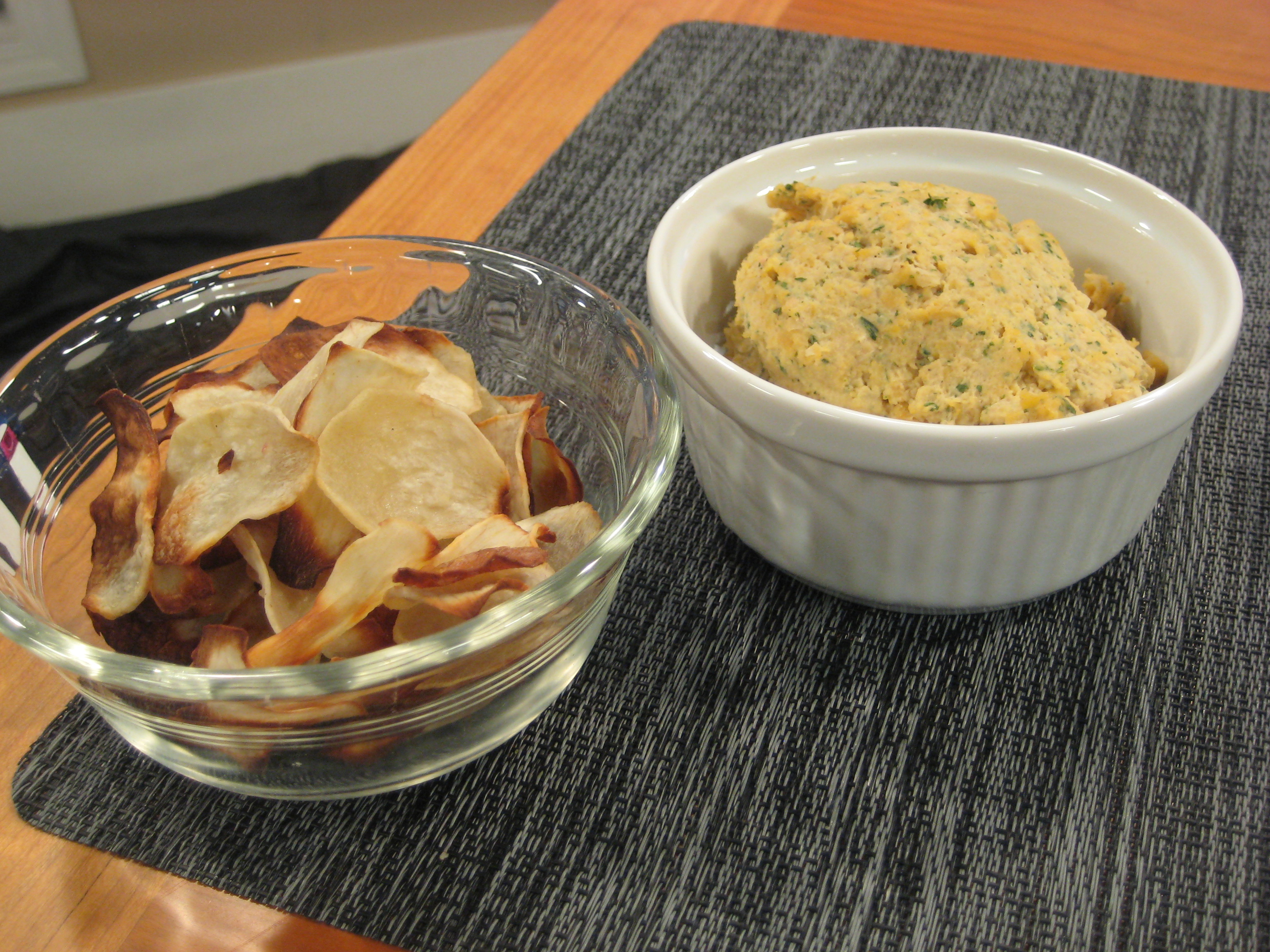 In order to make the chips meet my criteria for “power snacks”, I paired each of them with a variety of foods that are known to be high in protein and complex carbohydrates and minimal in healthy fats. The examples of power snacks that I showcased on the show today were almonds and mozzarella cheese with the apple chips, black bean salad with plantain chips, white bean dip for the sweet potato chips, Greek yogurt veggie dip for the kale, and hummus with taro root chips.